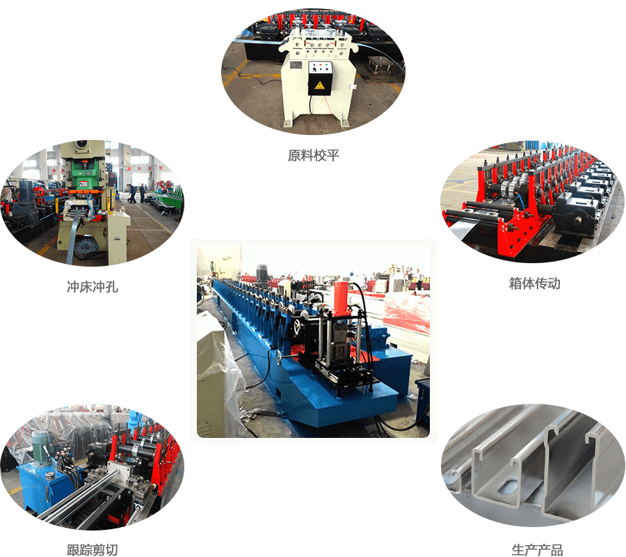 開(kāi)卷→動(dòng)力整平→儲(chǔ)料→CN伺服送料+自動(dòng)沖孔(沖LOGO)→儲(chǔ)料→輥壓成型【夾送引料→滾壓鋸齒→輥壓成型(噴淋冷卻)】→伺服跟蹤剪切(或鋸切)→出料→落料