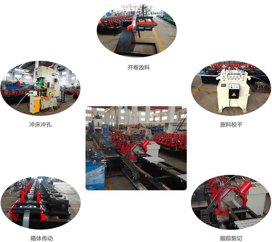 工藝流程: 開卷→動力整平→儲料→CN伺服送料+自動沖孔(沖LOGO)→儲料→輥壓成型【夾送引料→滾壓鋸齒→輥壓成型(噴淋冷卻)】→伺服跟蹤剪切(或鋸切)→出料→落料